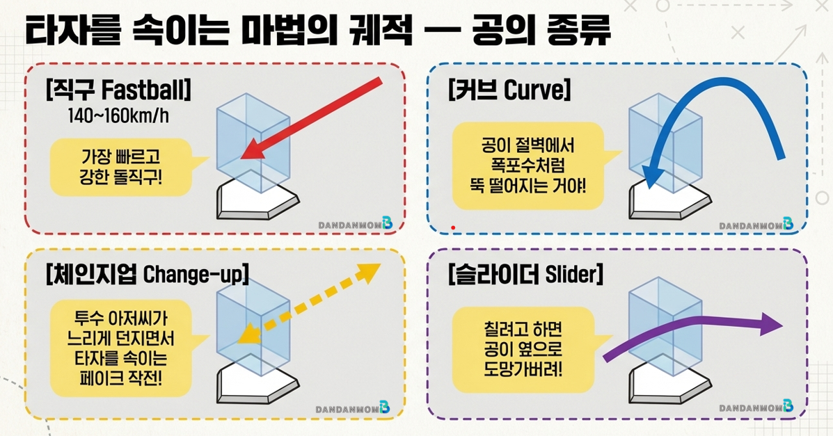 투수가 던지는 공은 똑바로만 날아가지 않아요. 실밥을 쥐는 그립에 따라 궤적이 마술처럼 바뀌어요!